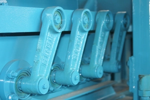 O mecanismo de manivela é empregado. Ele transmite o movimento circular da manivela para o movimento alternativo reto da fama móvel, o que garante que os paletes se movam suavemente e transmitam os produtos de forma estável.
